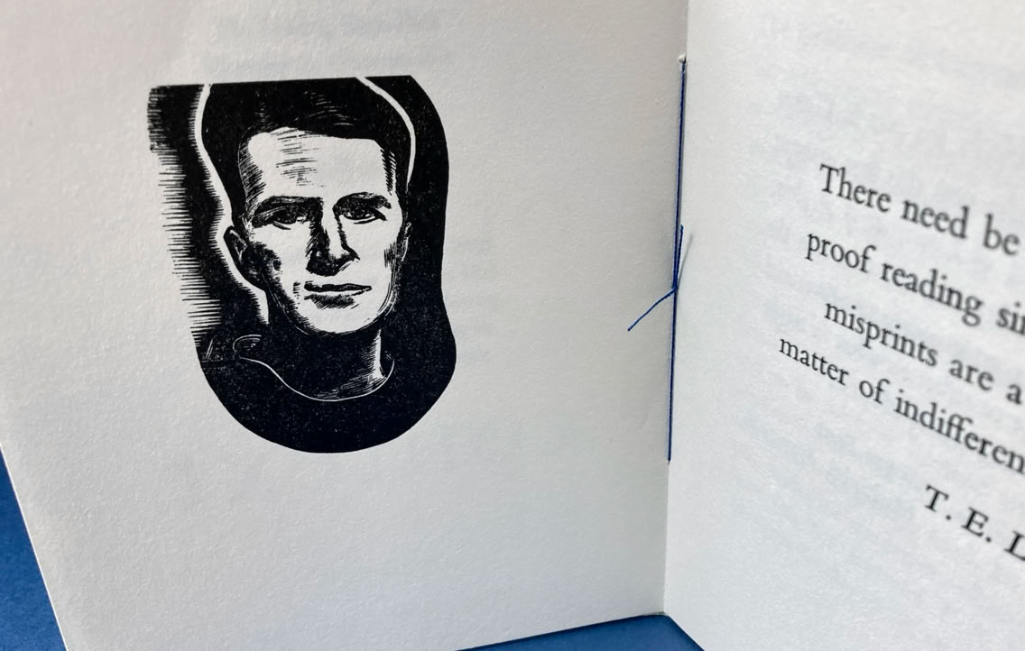 A T.E. Lawrence conceit being the reprinting of a discarded wood engraved portrait from the block, of Lawrence by George Buday, together with an intriguing quotation from one of his letters and brief commentaries by Simon Brett and the printer.