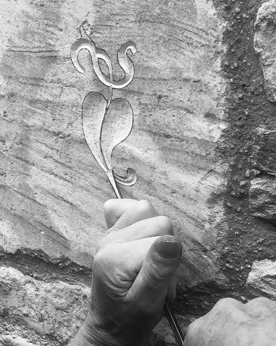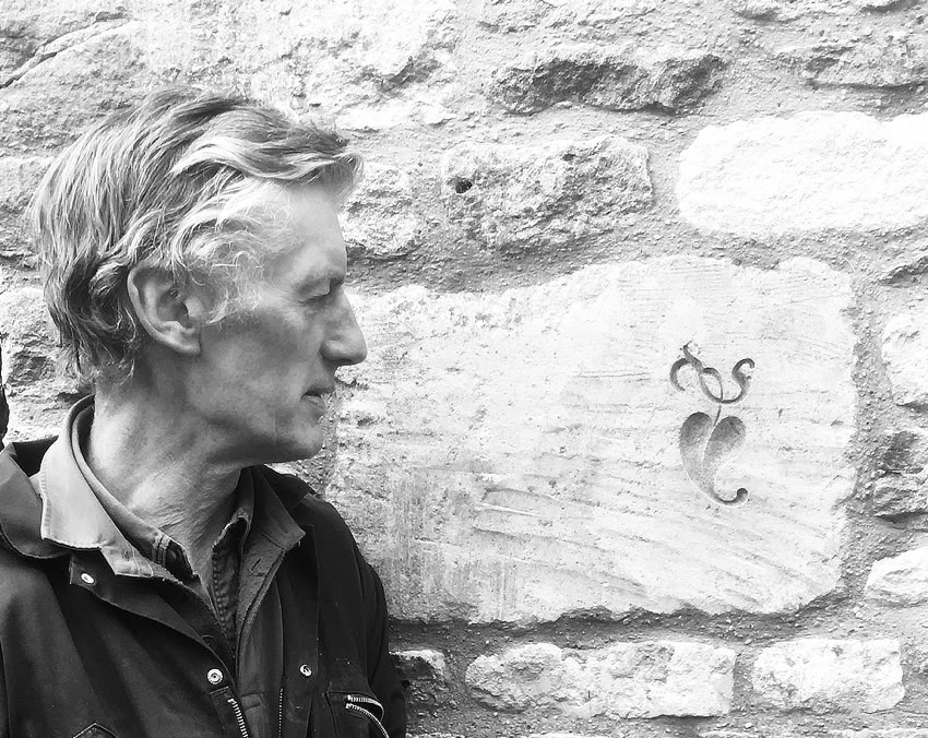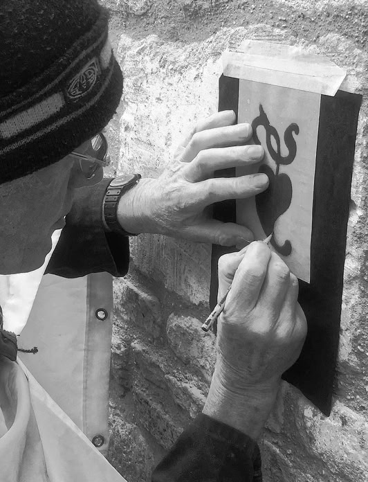 It had been my idea, inspired by Fergus Wessel’s work on the quoin-stones of the Whittington Press, to do something with the stone to the left of the door. Rory Young, that estimable stone-cutter and sculptor, for long had generously agreed to help. On a wet morning in June 2019 he came: