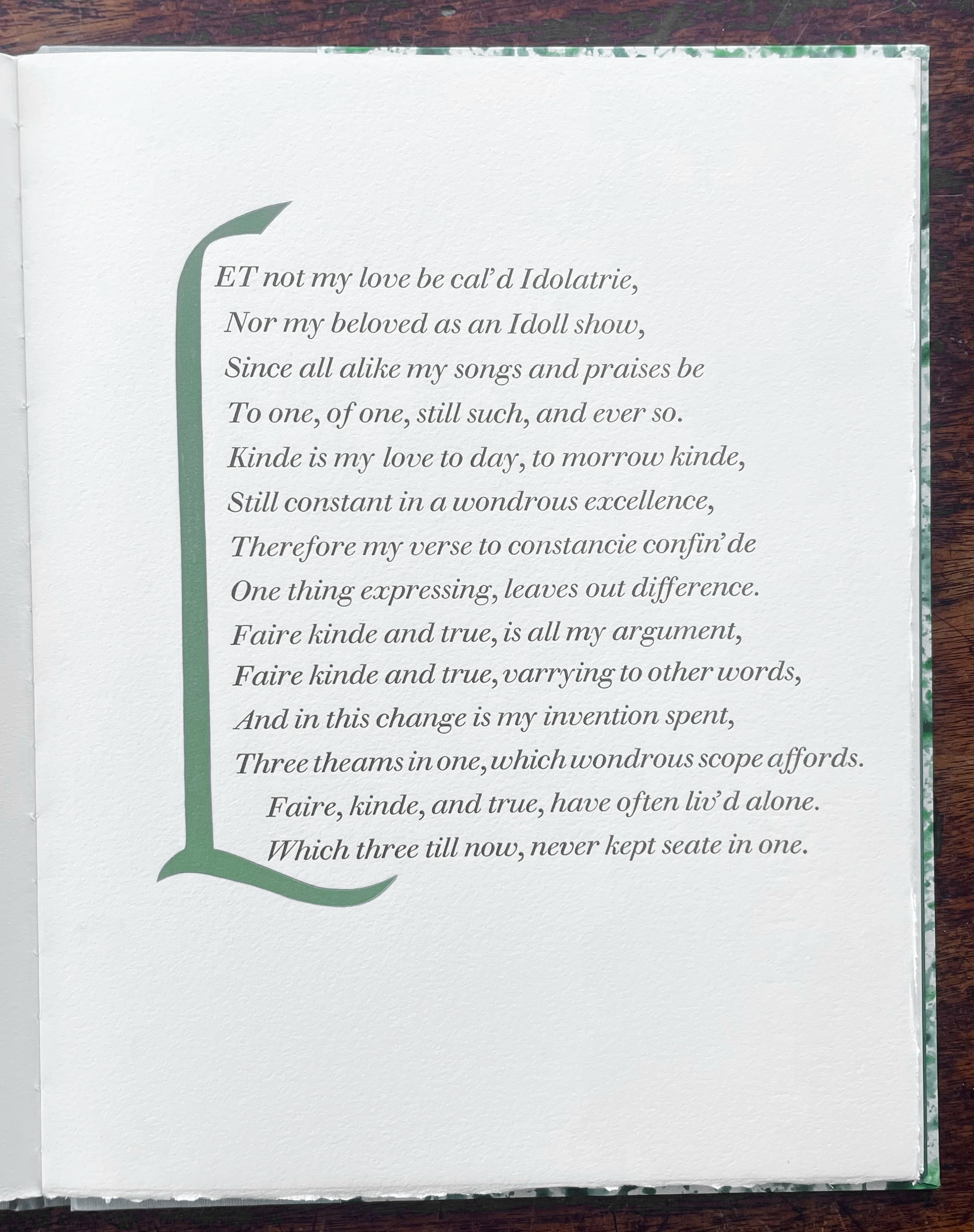There are twelve sonnets, each of which is set in a different typeface. Bound in quarter cloth by Ludlow Bookbinders using a hand-made paper from The Paper Foundation and paste patterned at Atelier GK Florence.